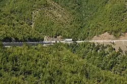 North of the pass road, the majority of the park is mostly undeveloped mountain land with forests, in which pine trees, and oak dominate. The black pines are up to 20 meters high and 60 years old—one of the main wood sources in Albania.[2][5] The forests provide opportunities for retreat for brown bears, wolves, foxes, and various birds,[2] actually being endangered from illegal deforestation.[5] The highest points on which it rises steeply from the Pass to the north, are the Maja e Liqenit (1724 meters) and the off peak Maja i Rjepat e Qetkolës ( 1686 meters). Maja e Liqenit should not be confused with the peak with the same name in Sharr region of Kosovo. In the southeast, the park is adjacent to the Dajti National Park[6] and in the southwest to the Kraste-Verjon Protected Landscape.