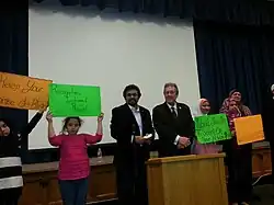 In March 2014, Shujaat Khan organized a Muslim holiday community forum at P.S. 69 in Queens, NY. At the event, New York City Council member Daniel Dromm was in attendance.