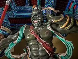 Shunfeng'er typically appears as a red- or brown-skinned demon cupping a hand to one of his ears. He also occasionally appears with three heads and six arms.[3] He usually appears to the left of his companion Qianliyan. Sometimes Shunfeng'er appears as the green demon, in which case he usually has one horn and ruby eyes.[19]