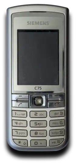 The Siemens C75 is a mobile phone sold by Siemens. The C75 is a triband cameraphone. It weighs 85 g and dimensions are 103 x 44 x 17 mm (length x width x depth). It includes GPRS class 10 connections with WAP 2.0 capability and IrDA. It supports polyphonic ringtones in MIDI and WAV formats. It has 10,2 MB of onboard memory available for the user. The phone also includes digital imaging and picture messaging. It has a built-in camera capable of taking pictures in VGA resolution (640 x 480 pixels) and recording videos. It also supports SMS archiving.