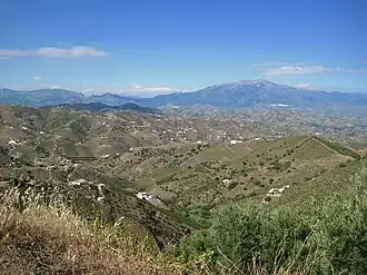 The Sierra de Tejeda is a small mountain range running in a northwest to southeast direction.[2] It lies in the east of the Málaga and the southwest of the Granada. It covers an area of 6,755 square kilometres (2,608 sq mi).[3] The Sierre de Tejeda lies to the southeast of the Sierra de Alhama and to the northwest of the Sierra de Almijara.[4] The Sierras of Tejida and Almijara form a single range about 40 kilometres (25 mi) west of the Sierra Nevada.[5] The mountains form part of a barrier between the coast and the interior.[6]