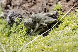 Sigaus nivalis shows multiple mating with a different non-bonded mate on each occasion.[12] When a male tries to mate, it often aggressively mounts a resisting female.[12] The male firmly grabs the female to prevent detachment by sudden disturbance.[12] Mating pairs have been observed from spring to autumn (September - April).[12] Gravid females were also observed from September to May except April, and number were highest in January and February.[12] Females show multiple oviposition.[13] Each egg pod may contain 20-30 eggs and first instars are observed in late December or early January.[12]
