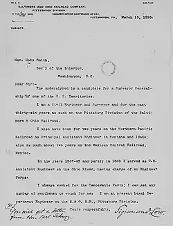 In Germany before coming to America, Low had undertaken surveys of the Rhine. After promotion to Master of Road[8] at P&C in 1866, Low was called into service as assistant civil engineer for the U.S. War Department, working under W. Milnor Roberts, and spent the next two years leading surveys of two sections of the Ohio River (Clipper Mills, Ohio to Cincinnati, Ohio and Evansville, Indiana to Cairo, Illinois). The surveys enabled the federal government to plan the mighty river's commercial development and management of its flooding.[9][10]