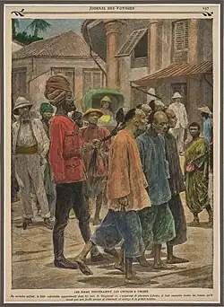 In 1912, the Journal des Voyages published a satirical print of Sikh policemen rounding up Chinese criminals by their queues in Singapore.[16]