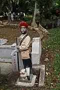 Bukit Brown ("Brown's Hill") is a Chinese cemetery in Singapore that features 25 pairs of guardian statues depicting Sikh men guarding the tombs.[21]: 74 The height of the Sikh guardian statues in the cemetery ranges from 3 to 6 feet.[21]: 74 They are placed to the front-right and front-left of the tombstone, with one exception of the Sikh guardian statue being placed behind the tombstone.[21]: 74 They were arranged in this manner as per feng shui principles.[21]: 74 The Sikh guardian statues were positioned just after the guardian statues of Chinese faeries.[21]: 74 The Sikh guardian statues of the Chinese cemetery are a reflection of the Singaporean Sikh community's reputation in the early 20th century of being superb watchmen.[21]: 74