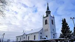 - In the rear of the church hangs a wooden chandelier and two wooden boards which have two angels painted on them. These inventories are relics from the old wooden church.