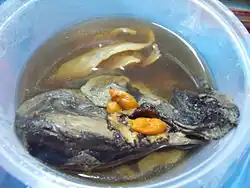 The black meat of a Silkie is generally considered an unusual attribute in European and American cuisines.[12] In contrast, several Asian cuisines consider Silkie meat a gourmet food. Chinese cuisine especially values the breed, but it is also a common ingredient in some Japanese, Cambodian, Vietnamese and Korean dishes. Areas where Chinese cuisine has a strong influence, such as Malaysia, may also cook Silkie. As early as the 7th century, traditional Chinese medicine has held that chicken soup made with Silkie meat is a curative food.[12] The usual methods of cooking include using Silkie to make broth, braising, and in curries. Traditional Chinese soup made with Silkie also uses ingredients such as wolfberries, Dioscorea polystachya (mountain yam), aged dried citrus peel, and fresh ginger.[23] A few fusion restaurants in metropolitan areas of the West have also cooked it as a part of traditional American or French cuisine, such as in confit.[12]