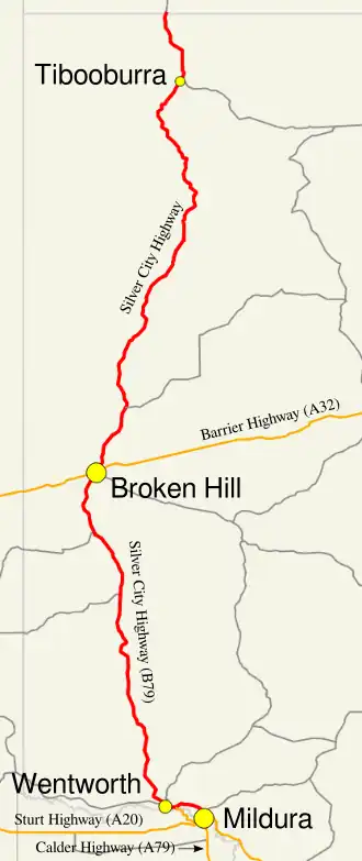 Silver City Highway is a 683-kilometre-long (424 mi)[1] highway that links Buronga, New South Wales to the Queensland border via Wentworth, Broken Hill, and Tibooburra, in the arid Far West region of New South Wales; a short branch also connects to Calder Highway on the Victorian border at Curlwaa (signed as Calder Highway). The namesake of the highway is derived from the moniker for Broken Hill – the "Silver City" – which the highway travels through. The highway is designated route B79 from Broken Hill to Buronga.