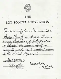 The Silver Wolf is the highest award made by The Scout Association "for services of the most exceptional character." It is an unrestricted gift of the Chief Scout. The award consists of a Silver Wolf suspended from a dark green and yellow neck ribbon.