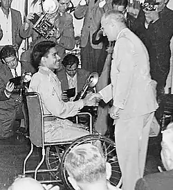 During a ninety-day furlough to Phoenix, he was notified that he was to receive the Medal of Honor and traveled to Washington with an uncle who was given time off from his job to help him make the trip. In time, Silvestre Herrera would be fitted with new prosthetic feet, but on August 23, 1945, at the White House, President Harry Truman bent over his wheelchair to present him with the Medal of Honor.[6]