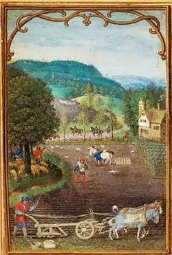 Bening specialised in Books of Hours, but by his time these were produced only for royal or very rich patrons. He also created genealogical tables and portable altarpieces on parchment as well as oil paintings on wooden panels. He was known to extend miniature painting into the borders. His usage of illusionistic picture frames serve to function as small devotional panels.[5] Many of his finest works are Labours of the Months for Books of Hours which are largely small-scale landscapes, at that time a nascent genre of painting. In other respects his style is relatively little developed beyond that of the years before his birth, but his landscapes serve as a link between the 15th-century illuminators and Pieter Brueghel the Elder. His self-portrait and other portraits equally are early examples of the portrait miniature.