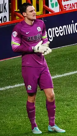 Eastwood rejected Portsmouth's offer and on 13 May 2013 agreed a deal in principle to join Championship club Blackburn Rovers.[25] He made his debut for the club on 7 August 2013 in a first round League Cup tie against Carlisle United, which Blackburn lost on penalties after a 3–3 draw.[26] In December he displaced Jake Kean as first-choice goalkeeper, making his Championship debut for the club on 7 December 2013 in an away match against Queens Park Rangers, putting in an impressive performance and keeping a clean sheet in a 0–0 draw. After seven matches as first choice, Eastwood returned to being back-up as Paul Robinson returned from injury and reclaimed his number one spot. On 28 February 2014, Eastwood signed a new contract until the summer of 2016.[27]