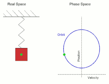 Note if the real space and phase space plot are not co-linear, the phase space motion becomes elliptical. The area enclosed depends on the amplitude and the maximum momentum.