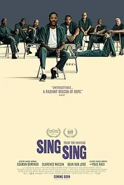 Sing Sing is a 2023 American prison drama film directed by Greg Kwedar and written by Clint Bentley and Kwedar. Based on the real-life Rehabilitation Through the Arts program at Sing Sing Maximum Security Prison, the film centers on a group of incarcerated men involved in the creation of theatrical stage shows through the program.[4] It stars professional actors Colman Domingo, Sean San José and Paul Raci, alongside many real-life formerly incarcerated men who were themselves alumni of the program during their incarceration, including Clarence "Divine Eye" Maclin and Jon-Adrian "JJ" Velazquez.[4][5][6]