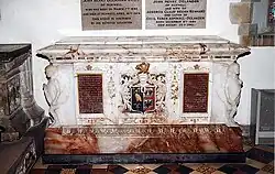 He died in 1874, the last of the family. He was buried in St. Mary's Church, Brading (alongside many of his ancestors) and has an arts and crafts style tomb.[6] The west doorway of the Church of St. John the Evangelist, Sandown was built in the Norman style as a memorial to him.[7] His wife, Louisa, died in 1894.[8]