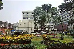 The campus is located at Mitford road, Babubazar, Old Dhaka, the historic old part of Dhaka city.[12] It is spread over about 2.8 acres of land, on the bank of Buriganga river.[13] The medical college building is situated to the south-east of the hospital area, near the river bank with a large garden in front.[14] The building is four-storeyed with a floor space of 4,940 square meters on each floor. The building accommodates the Departments of Anatomy, Pathology, Biochemistry, and Microbiology. The Departments of Physiology, Pharmacology, Community Medicine, and Forensic Medicine are housed in another building in front of the main building.[7]