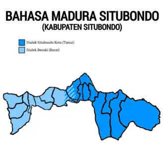 Despite the homogeneous linguistic situation in Situbondo and Bondowoso regencies, variations in the Madurese language still occur. This can be seen from the division of dialect areas in Bondowoso and Situbondo regencies, even though In this case, Situbondo and Bondowoso are the same dialect, namely Eastern Madurese dialect. In this case, especially Situbondo, according to Madurese speakers in Situbondo, the western part of Situbondo near Panarukan and Besuki to the border of Probolinggo is the Western Madurese dialect. Meanwhile, the eastern part of Situbondo, starting from the Situbondo Kota to the border with Banyuwangi near Banyuputih, is the Eastern Madurese dialect.[13]