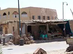 The ancient fortress of Siwa, known as the Shali Ghadi (Shali being the name of the town, and Ghadi meaning "remote"), was built on natural rock (an inselberg) and made of kershif (salt and mud-brick)[1] and palm logs. After it was damaged by three days of heavy rains in 1926[28] it was abandoned for similar unreinforced construction housing on the plain surrounding it, and in some cases those, in turn, have been replaced by more modern cinder block and sheet metal roof buildings. Only one building in the Shali complex has been repaired and is in use, a mosque. Gradually eroded by infrequent rains and slowly collapsing, the Shali remains a prominent feature, towering five stories above the modern town and lit at night by floodlights. It is most easily approached from its southwest side, south of the end of the paved road which curves around from the north side of the Shali. Several uneven pedestrian streets lead from the southwest end of the Shali into it, and the ground is rent in places by deep cracks. Many of the unreinforced kershif buildings bordering the streets of the Shali are also split by large cracks, or they are partially collapsed.