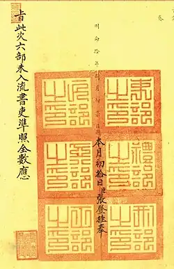 The Six Boards were established in 1802 after Gia Long's coronation, however they were not fully operational until 1830.[4] Each board had a president (Thượng thư, 尚書), supported by two vice-presidents (Tham tri, 參知). In 1826 emperor Minh Mạng added two vice-minister into each board (Thị lang, 侍郎). By the mid-1840s, the six ministries comprised almost 100 people, included secretaries serving on their boards.[5] In 1907, emperor Duy Tân founded the Ministry of Education to take over a number of functions of the Board of Rites. Cao Xuân Dục was chosen to be its first minister.[6]