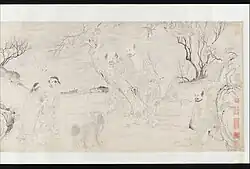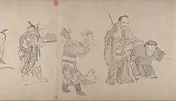 The Sixteen Arhats (Chinese: 十六羅漢, pinyin: Shíliù Luóhàn, Rōmaji: Jūroku Rakan; Tibetan: གནས་བརྟན་བཅུ་དྲུག, "Neten Chudrug") are a group of legendary Arhats in Buddhism. The grouping of sixteen Arhats was brought to China, and later to Tibet, from India. In China, an expanded group of Eighteen Arhats later became much more popular, but worship of the sixteen Arhats still continues to the present day in China, Japan and Tibet. In Japan sixteen Arhats are particularly popular in Zen Buddhism, where they are treated as examples of behaviour.[1] In Tibet, the sixteen Arhats, also known as sixteen sthaviras ('elders') are the subject of a liturgical practice associated with the festival of the Buddha's birth,[2] composed by the Kashmiri teacher Shakyahribhadra (1127-1225).[3] They are also well represented in Tibetan art.[4]