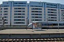 Skøyen Station (Norwegian: Skøyen stasjon) is a railway station located at Skøyen in Oslo, Norway. It is situated on the Drammen Line, 4.36 kilometers (2.71 mi) from Oslo Central Station. It is served by regional trains and the Oslo Commuter Rail, operated by Vy, as well as by the Airport Express Train. The station is elevated and has two island platforms and four tracks.