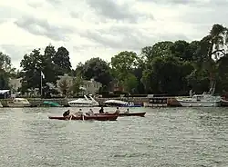The regatta was originally the Teddington Reach Regatta held at Teddington, which was founded in 1892 as the Teddington Reach Aquatic Sports. At that time there were events for canoeing, dongola racing, tug-of-war in punts and swimming as well as the skiff racing. The Gentlemen's Double Sculls event at that regatta was nominated as the Championship of the Thames in 1897 and by 1906 the Gentlemen's Single Sculls, the Mixed Double Sculls and Ladies' Double Sculls were accorded Championship status. The Ladies' Single Sculls were introduced in 1957. The course was 1000 metres upstream from Teddington Lock to Steven's Eyot.