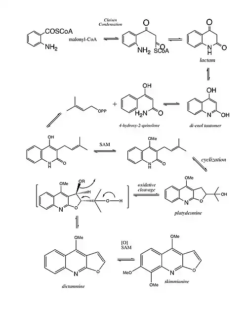 With the formation of quinolone, alkylation is happening at C-3 position by introducing dimethylallyl diphosphate. Another key step is the cyclization on the dimethylallyl sidechain, forming a new heterocyclic five-member-ring.[4] Platydesmine is then forming an intermediate through the oxidative cleavage reaction[5] by losing an isopropyl group to form dictamine. Finally, skimmianine is formed through the hydroxylation of dictamine.