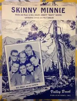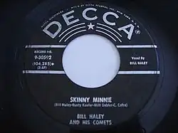 "Skinny Minnie" was composed by Bill Haley with Milt Gabler, Rusty Keefer, and Catherine Cafra. The song was released as a Decca single, 9-30592, backed with "Sway With Me", reaching no. 22 on the Billboard chart and no. 25 on the Cash Box chart.[1] The song was featured on the 1958 Decca album Bill Haley's Chicks.[2] The song became a rock and roll standard which was covered by scores of bands and singers.