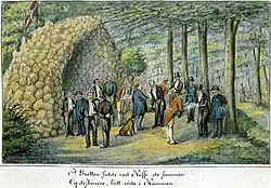 In the park to the south of Countess Danner's Mansion is a grotto which was built by Frederick VII in 1853. It is made of travertine, flint and iron slag. Its interior features imitated stalactites and the floor is decorated with pale and dark beach stones set in a star-shaped pattern. A winding, partly internal staircase on the rear side of the mound leads to the top for good views of Skodsborg and the Øresund.[8]