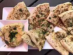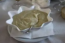 Skordalia (alternatively skordhalia or skorthalia) (Greek: σκορδαλιά [skorðaˈʎa], also called αλιάδα, aliada/aliatha) is a thick purée in Greek cuisine, made of garlic in a base of potatoes, walnuts, almonds or liquid-soaked stale bread mixed with olive oil in to make a smooth emulsion, to which some vinegar is added.[1][2][3] It is usually made in a mortar and pestle. Skordalia is served as a sauce, side dish, or dip. It is mainly served with fried cod on the Greek national holiday of March 25th.