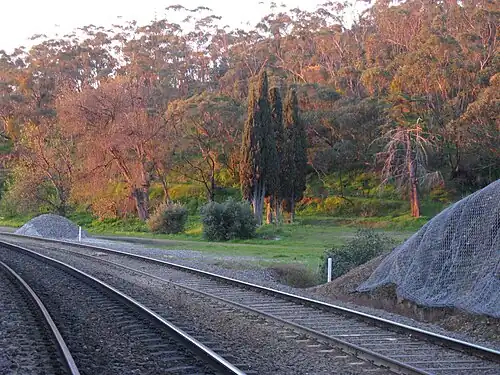 From 1909, a branch line, parallel to the main line and the Clapham branch line, served the Sleeps Hill quarries. The branch became the second main line in 1915, and the quarries were worked by a backshunt from Eden Hills. For a short time, from 1916, Sleeps Hill was the Southern limit of SAR suburban train workings, until the double track passed through the new tunnels to Eden Hills. The station was relocated to the south of the quarry sidings in the 1940s[1] and removed when Lynton station was opened in the mid-1950s.[2] Some of the foundations of the station buildings, the trees from the station gardens, some of the foundations of the quarry crushing plant, and evidence of the alignment of the spur lines and sidings are all that remain.