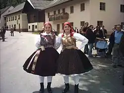 Boys take girls likewise dressed in colorful Gailtal costumes, under the linden tree (na rej pod lipo). Dancing is accompanied with songs in Slovene and German.[6][7]