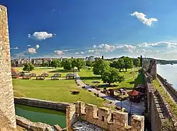 The modern founder of the city was the Serbian despot Đurađ Branković in the 15th century, who built Smederevo Fortress in 1430 as the new Serbian capital.[8] According to the Greek historian Theodore Spandounes, the fortress was constructed by George Kantakouzenos, Branković's brother-in-law through his consort the Byzantine princess Irene.[9] Smederevo was the residence of the Branković house and the capital of the Serbian Despotate from 1430 until 1439, when it was conquered by the Ottoman Empire after a siege lasting two months.