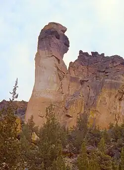 The geology of Smith Rocks is volcanic. It is made up of layers of recent basalt flows overlaying older Clarno ash and tuff formations. Approximately 30 million years ago, a large caldera was formed (Crooked River caldera) when overlying rock collapsed into an underground magma chamber. This created a huge amount of rock and ash debris that filled the caldera. That material solidified into rock, becoming the rhyolite tuff of Smith Rock. Rhyolite dikes intruded along faults in the tuff.[5] A half million years ago, basalt lava flows from nearby volcanoes covered the older tuff.[2][4][6]