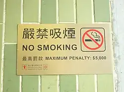 Tobacco smoking in Hong Kong has declined in recent decades, with 10 percent of Hong Kongers smoking on a daily basis as of 2017. It is the policy of the Hong Kong government to discourage smoking. Smoking is banned in most public places and tobacco advertising is prohibited. Active smoking accounted for 26.3% of deaths in people aged 35 or over.[1] Annual tobacco-related diseases reached US$1.27 billion (0.3% of 2021 Hong Kong GDP) in 2021.[1]