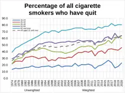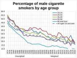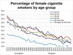 In 2015, it was reported smoking rates in England had fallen to 16.9%, a record low.[20] In 2018, the UK smoking rate had fallen to 14.4%.[21] 25–34 year olds had the highest smoking rate, with approximately 1 in 5 people within this age range (around 1.4 million adults) being smokers.