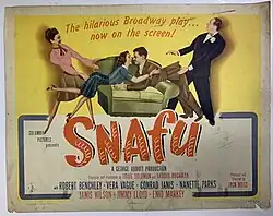 Snafu is a 1945 American comedy film directed by Jack Moss and written by Louis Solomon and Harold Buchman. It is based on the 1944 play Snafu by Louis Solomon and Harold Buchman. The film stars Robert Benchley, Barbara Jo Allen, Conrad Janis, Nanette Parks, Janis Wilson, Jimmy Lloyd and Enid Markey. The film was released on November 22, 1945, by Columbia Pictures.[1][2][3]