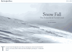 "Snow Fall: The Avalanche at Tunnel Creek," is a New York Times multimedia feature by reporter John Branch about the 2012 Tunnel Creek avalanche, published on December 20, 2012. The article won the 2013 Pulitzer Prize in Feature Writing and a Peabody Award.[1] Packaged together as a six-part story interwoven with interactive graphics, animated simulations and aerial video, "Snow Fall" became one of the most talked about online news articles in 2013 and garnered praise and debate over it being an example of "the future of online journalism."[2] The article became highly influential among online journalism circles, with many other publications attempting similar multimedia features and even coined an industry term, "to snowfall."[3]