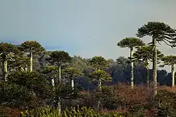 During the Campanian–Maastrichtian, the Antarctic Peninsula supported temperate, humid forests dominated by podocarps, araucarian conifers, and a diversifying group of angiosperms. Key angiosperm families included Nothofagaceae, Monimiaceae, Cunoniaceae, Proteaceae, Myrtaceae, Lauraceae, Atherospermataceae, Winteraceae, and extinct Sassafras-like forms.[41][42] Another important group is Asteraceae, with Dasyphyllum-like pollen, the oldest fossils ever found for the family.[43] Ferns such as Osmundaceae and Gleicheniaceae formed part of the understorey. Fossil evidence (wood, pollen, leaves) comes mainly from Seymour, Vega, James Ross, and Snow Hill islands. Forests were structurally similar to modern Valdivian temperate forests. The flora reflects a transition from gymnosperm-dominated to mixed angiosperm-conifer ecosystems under polar greenhouse conditions.[41][44]
