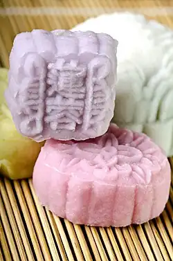 Snow skin mooncake, snowy mooncake, ice skin mooncake or crystal mooncake is a Chinese confection eaten during the Mid-Autumn Festival. It is a cold mooncake with glutinous rice skin, originating from Hong Kong.[1] [2] Snow skin mooncakes are also found in Macau, mainland China, Taiwan, Singapore, Malaysia and Indonesia.[3] Although snow skin mooncakes are usually made and sold by bakeries, these mooncakes are not baked in ovens like traditional cakes. Unlike traditional mooncakes which are served at room temperature, snow skin mooncakes are typically eaten cold.