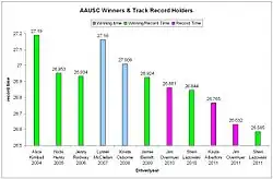 No Derby Rule Book ever stated that girls were unable to compete officially, but it was suggested in the language of promotional material and newspaper advertisements, with Chevrolet dealerships even refusing to accept girl applicants or sell them wheels and axles.[103] There was also resistance from many, including its founder Myron Scott,[104] who stated that he devised the sport to be exclusively 'boys only' from the start.[15] Counter to this, popular opinion was positing a more liberal stance, with Chevrolet receiving legal pressure from local Derby organizations wishing to enter girls. This coupled with the fact that former racers that were now dads wanted to participate in Derby once more by putting their child into a car, but only had daughters. Mason Bell, general manager of the Soap Box Derby from 1964 to 1972, knew that it was only a matter of time before girls be let in.[105]