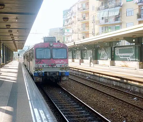 Soccavo railway station (Italian: Stazione di Soccavo) is a railway station in Naples, Italy. It is served by the Circumflegrea railway line, managed by EAV. The station was renovated in 1990 by architect Nicola Pagliara, replacing the previous building with a new one featuring a brick curtain façade, aluminum panels, and glass blocks.[1]
