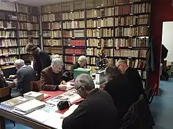 Long animated by a team of members around Daniel Schweitz,[6] the library now directed by Florence Cailleau, includes, in addition to the complete collection of memoirs and bulletins published by the society since 1840, about 11,000 books and brochures dealing mainly with the history, archaeology, and heritage of Touraine and neighboring provinces, and a collection of private archives. Access is free to any authorized researcher or reader in the reading room, where they can find the necessary assistance from the librarian. The society's publications are also consultable in several places in Tours: Departmental Archives, Municipal Archives, Central Library for Lending, and the Center for Contemporary Archives of Indre-et-Loire, as well as on Gallica and in various locations in Paris and France.[7] The society's library provides tools for research in its publications.[8] An annual activity report is published in the Bulletin since 2006.