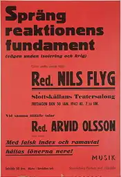 1942 poster of the Uppsala party branch. Reads 'Blow up the Foundations of Reaction (the way out of war and isolation)'. Speakers were Nils Flyg and Arvid Olsson.