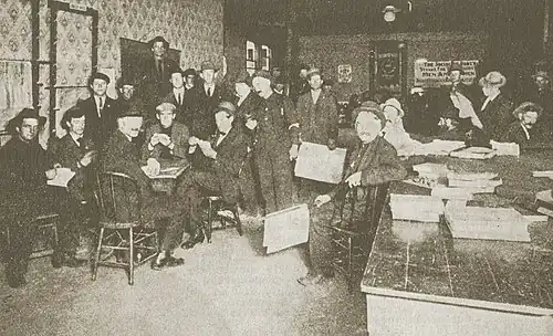 A short-lived effort to organize unemployed workers took place in 1912 with the formation of a mass organization called the "League of the Unemployed."[20] An initial membership of 1,000 was dubiously reported in the press,[20] an error resulting from sloppy misreporting of a January 21 open air meeting in Portland at which "nearly 1,000 men raised their hand in response to the query as to how many were unemployed."[21] An organizing committee of 8, headed by Tom Lewis, was named and a march planned for January 28.[21] This effort appears to have fizzled and the new auxiliary organization vanished without a trace.