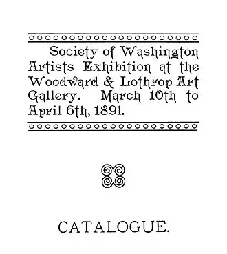 The Society's first exhibit was in 1891, held at the Woodward & Lothrop building. Within a few years the Society had its own gallery space at 1020 Connecticut Avenue. In that space the Society exhibited loaned art work held in private collections in Washington, D.C. By 1900 the Society's annual exhibits included out-of-town artists and were the forerunners of the Corcoran Gallery's Biennial Exhibition of Contemporary American Art.[2][1]