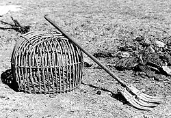 Basket and fork for gathering the dung (used as fuel in the yurts), Sükhbaatar Aimag, Mongolia, 1972