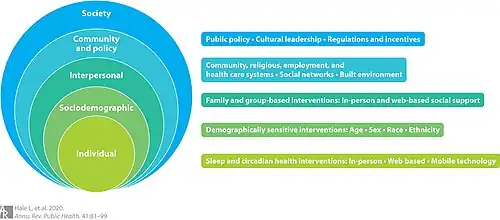 - ^ Hale, Lauren; Troxel, Wendy; Buysse, Daniel J. (2020). "Sleep Health: An Opportunity for Public Health to Address Health Equity". Annual Review of Public Health. 41: 81–99. doi:10.1146/annurev-publhealth-040119-094412. PMC 7944938. PMID 31900098.