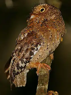 Like other Otus owls, they are strictly nocturnal, making their biology difficult to study.[8] They are most active immediately after dark and before dawn and travel further from their roost sites to forage when there is less illumination from the Moon.[9] They roost in the dense understory of Cynometra trees during the day. The mean home-range of a pair is 11 ha and there is very little overlap with neighboring pairs.