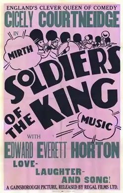 Soldiers of the King is a 1933 British historical comedy film directed by Maurice Elvey and starring Cicely Courtneidge, Edward Everett Horton and Anthony Bushell.[1] It was Courtneidge's fourth film, and the first she appeared in without her husband Jack Hulbert.[2] Courtneidge plays the matriarch of a music hall family, in a plot that switches between the Victorian era and the 1930s present.